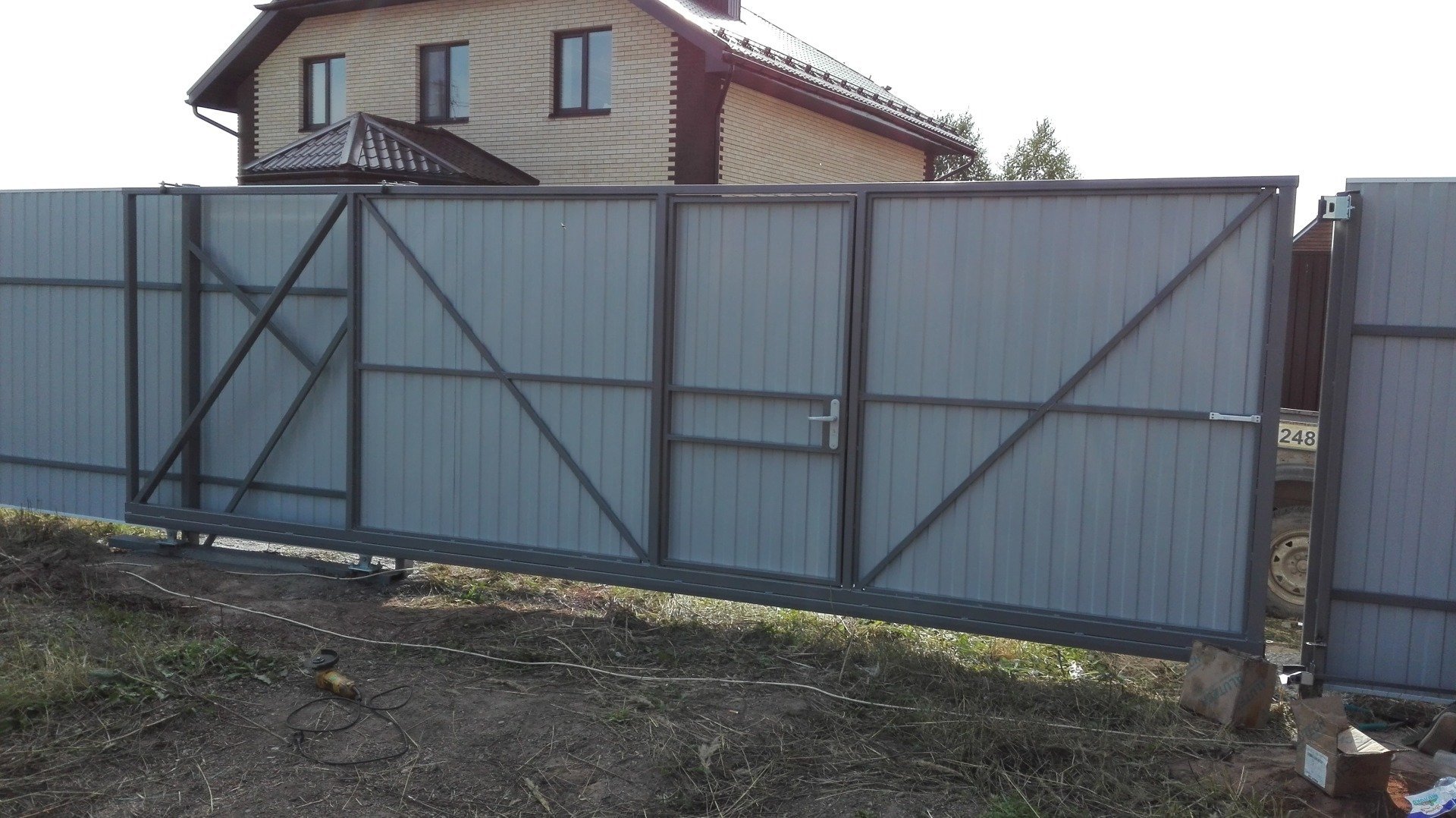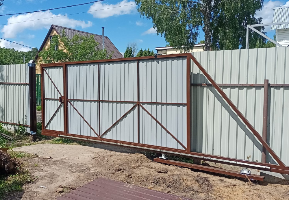 Откатные ворота из профнастила с встроенной калиткой и автоматикой
